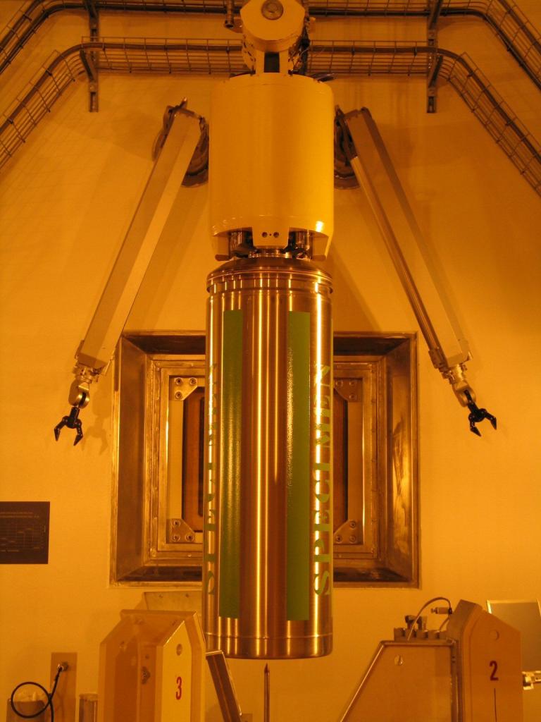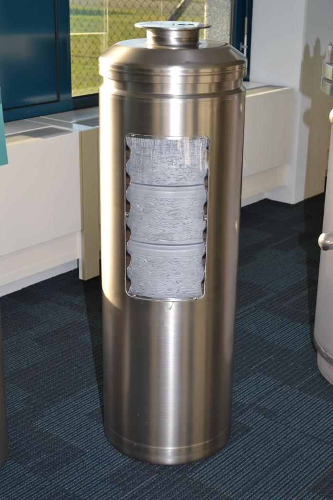 | This photo shows a waste package than can contain irradiated zircaloy and steel | This photo shows the remote handling of this packagecontaining these irradiated metals |